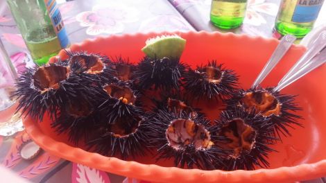 lasciato il terrible friday arriva l'agognato sabato. Bianca e Paolo mi invitano ad andaro con loro altri colleghi della Cooperazione italiana a passare la giornata sulla spiaggia des Almadies, quartiere figo di Dakar, a due passi dall'Ambasciata Americana, sobria costruzione grande come un Paese abruzzese di montagna. La scusa è quella di andare al mare, la realtà è quella di andare a magnare pesce in uno dei ristorantini sul mare, prezzo basso e resa alta. La spiaggia è carina ma un po' risicata, il mare si apre alla vista, è Oceano aperto, dopo poche centinaia di metri si scorgono onde e marosi di una certa ampiezza. Il ristornatino non è male, grezzo e feroce il giusto offre una bella scelta di piatti a prezzi più che abbordabili, peccato che da ste parti non esista la possibilità di abbinare un vinello bianco, anche della casa, per poter far quadrare il cerchio gustativo. Ci dobbiamo accontentare della birra Gazelle, vabbè. Io per non farmi mancare nulla prendo un piattone di vongole in condivisione con Paolo, un piatto di ricci di mare (è la mia prima volta!!!) in condivisione con tutti e un piatto spiedini di calamari in condivisione solo con me.