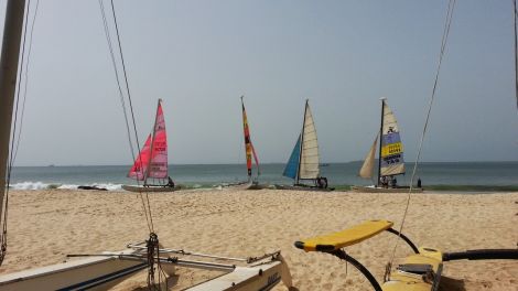 Facciamo rotta verso Goree, insieme a noi ci sono altri 4 catamarani dello stesso circolo velico in cui Aldo è socio, dopo un po' di tempo utile per capire come funziona ci diamo all'inseguimento degli altri ed in un quarto d'ora li riprendiamo tutti, circumnavighiamo l'isola, quindi cominciamo a sentire in faccia una bella brezza che ci fa pregustare una bolina di rientro da urlo, quando..... Zac!!! si stacca una piastrina della sartia e in un attimo l'albero è giù in acqua!!!