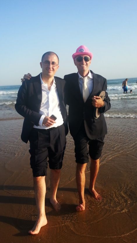 Dopo un paio d'ore di decompressione e foto di rito ci spostiamo sulla spiaggia dove si tiene il ricevimento. Vestiti di tutto punto (giusto ci arrotoliamo le braghe dell'abito fino al ginocchio) scendiamo sulla spiaggia e ci fotografiamo con i piedi a mollo e la cravatta al collo per la gioia e il ludibrio dei bagnanti.